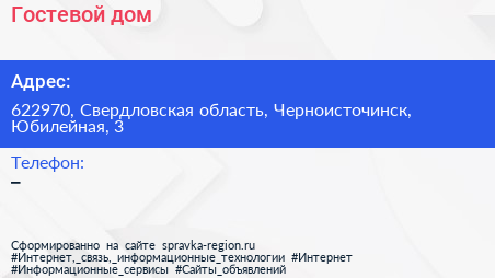 Гостевой дом по адресу 622970, Свердловская область, Черноисточинск, Юбилейная, 3 в дальнейшем Организация, размещена в следующих категориях: