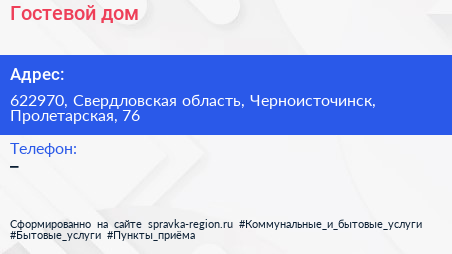 Гостевой дом по адресу 622970, Свердловская область, Черноисточинск, Пролетарская, 76 в дальнейшем Организация, размещена в следующих категориях: