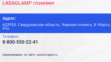 LADAGLAMP, глэмпинг по адресу 622910, Свердловская область, Черноисточинск, 8 Марта, 47а в дальнейшем Организация, размещена в следующих категориях: