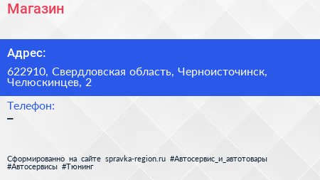 Магазин по адресу 622910, Свердловская область, Черноисточинск, Челюскинцев, 2 в дальнейшем Организация, размещена в следующих категориях: