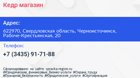 Кедр, магазин по адресу 622970, Свердловская область, Черноисточинск, Рабоче-Крестьянская, 20 в дальнейшем Организация, размещена в следующих категориях: