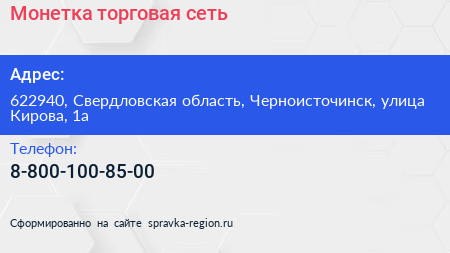Монетка, торговая сеть по адресу 622940, Свердловская область, Черноисточинск, улица Кирова, 1а в дальнейшем Организация, размещена в следующих категориях: