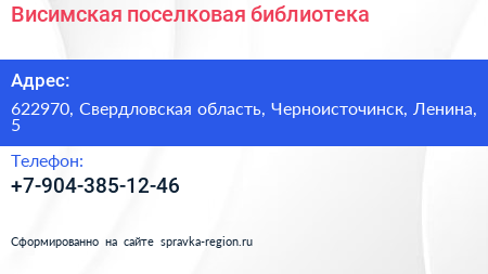 Висимская поселковая библиотека по адресу 622970, Свердловская область, Черноисточинск, Ленина, 5 в дальнейшем Организация, размещена в следующих категориях: