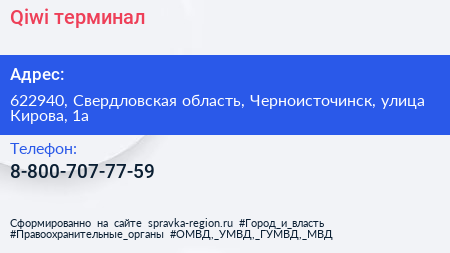 Qiwi, терминал по адресу 622940, Свердловская область, Черноисточинск, улица Кирова, 1а в дальнейшем Организация, размещена в следующих категориях: