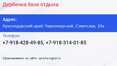 Дербенка, база отдыха по адресу Краснодарский край, Черноморский, Советская, 24а в дальнейшем Организация, размещена в следующих категориях: