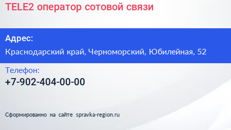 TELE2, оператор сотовой связи по адресу Краснодарский край, Черноморский, Юбилейная, 52 в дальнейшем Организация, размещена в следующих категориях: