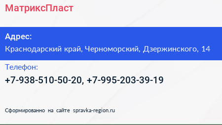 МатриксПласт по адресу Краснодарский край, Черноморский, Дзержинского, 14 в дальнейшем Организация, размещена в следующих категориях: