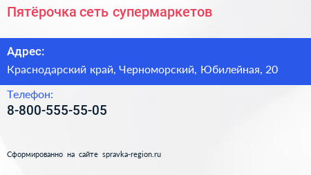 Пятёрочка, сеть супермаркетов по адресу Краснодарский край, Черноморский, Юбилейная, 20 в дальнейшем Организация, размещена в следующих категориях: