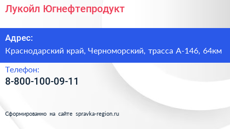 Лукойл-Югнефтепродукт по адресу Краснодарский край, Черноморский, трасса А-146, 64км в дальнейшем Организация, размещена в следующих категориях: