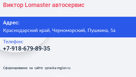 Виктор Lomaster, автосервис по адресу Краснодарский край, Черноморский, Пушкина, 5а в дальнейшем Организация, размещена в следующих категориях: