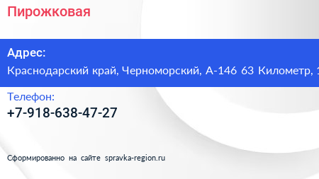 Пирожковая по адресу Краснодарский край, Черноморский, А-146 63 Километр, 1 в дальнейшем Организация, размещена в следующих категориях: