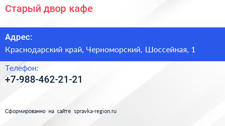 Старый двор, кафе по адресу Краснодарский край, Черноморский, Шоссейная, 1 в дальнейшем Организация, размещена в следующих категориях: