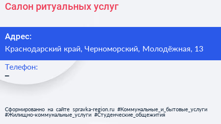 Салон ритуальных услуг по адресу Краснодарский край, Черноморский, Молодёжная, 13 в дальнейшем Организация, размещена в следующих категориях:
