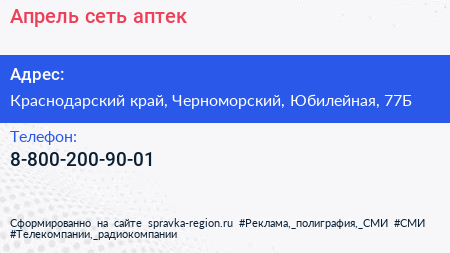 Апрель, сеть аптек по адресу Краснодарский край, Черноморский, Юбилейная, 77Б в дальнейшем Организация, размещена в следующих категориях: