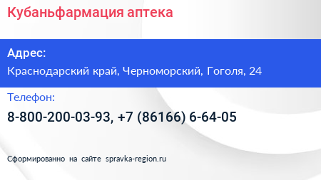 Кубаньфармация, аптека по адресу Краснодарский край, Черноморский, Гоголя, 24 в дальнейшем Организация, размещена в следующих категориях:
