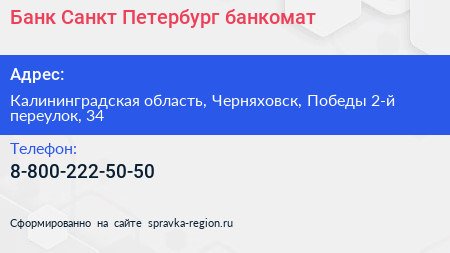 Банк Санкт-Петербург, банкомат по адресу Калининградская область, Черняховск, Победы 2-й переулок, 34 в дальнейшем Организация, размещена в следующих категориях: