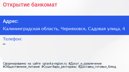 Открытие, банкомат по адресу Калининградская область, Черняховск, Садовая улица, 4 в дальнейшем Организация, размещена в следующих категориях: