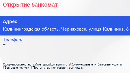Открытие, банкомат по адресу Калининградская область, Черняховск, улица Калинина, 6 в дальнейшем Организация, размещена в следующих категориях: