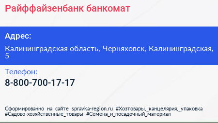 Райффайзенбанк, банкомат по адресу Калининградская область, Черняховск, Калининградская, 5 в дальнейшем Организация, размещена в следующих категориях: