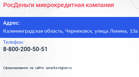 РосДеньги, микрокредитная компания по адресу Калининградская область, Черняховск, улица Ленина, 13а в дальнейшем Организация, размещена в следующих категориях: