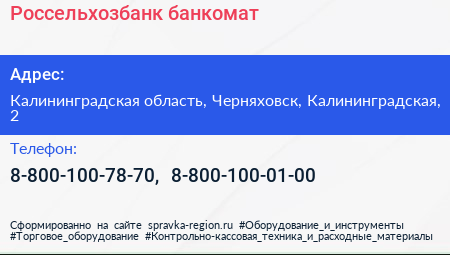Россельхозбанк, банкомат по адресу Калининградская область, Черняховск, Калининградская, 2 в дальнейшем Организация, размещена в следующих категориях: