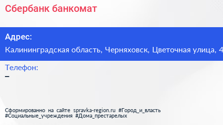 Сбербанк, банкомат по адресу Калининградская область, Черняховск, Цветочная улица, 4 в дальнейшем Организация, размещена в следующих категориях: