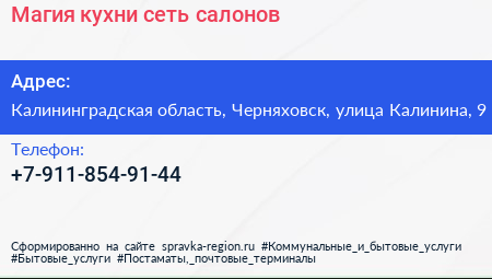 Магия кухни, сеть салонов по адресу Калининградская область, Черняховск, улица Калинина, 9 в дальнейшем Организация, размещена в следующих категориях: