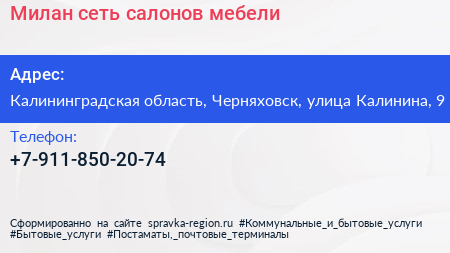 Милан, сеть салонов мебели по адресу Калининградская область, Черняховск, улица Калинина, 9 в дальнейшем Организация, размещена в следующих категориях: