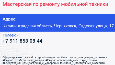 Мастерская по ремонту мобильной техники по адресу Калининградская область, Черняховск, Садовая улица, 17 в дальнейшем Организация, размещена в следующих категориях: