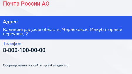Почта России, АО по адресу Калининградская область, Черняховск, Инкубаторный переулок, 2 в дальнейшем Организация, размещена в следующих категориях: