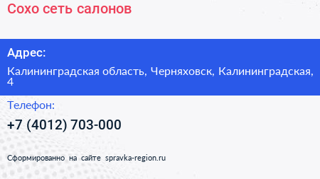 Сохо, сеть салонов по адресу Калининградская область, Черняховск, Калининградская, 4 в дальнейшем Организация, размещена в следующих категориях: