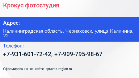 Крокус, фотостудия по адресу Калининградская область, Черняховск, улица Калинина, 22 в дальнейшем Организация, размещена в следующих категориях: