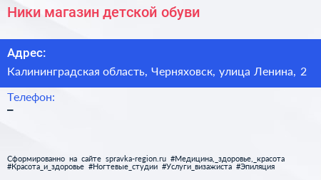 Ники, магазин детской обуви по адресу Калининградская область, Черняховск, улица Ленина, 2 в дальнейшем Организация, размещена в следующих категориях: