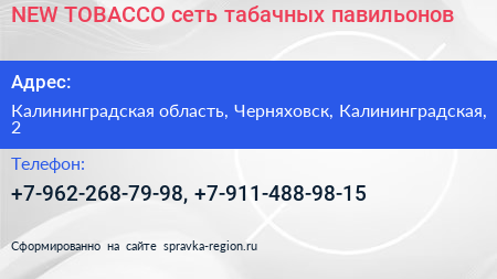 NEW TOBACCO, сеть табачных павильонов по адресу Калининградская область, Черняховск, Калининградская, 2 в дальнейшем Организация, размещена в следующих категориях: