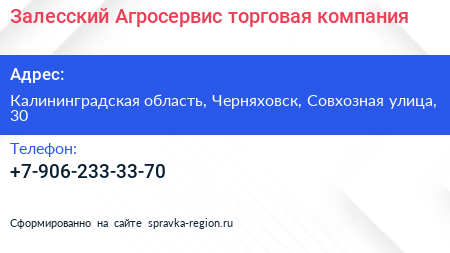 Залесский Агросервис, торговая компания по адресу Калининградская область, Черняховск, Совхозная улица, 30 в дальнейшем Организация, размещена в следующих категориях:
