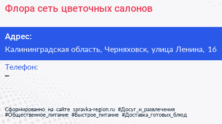 Флора, сеть цветочных салонов по адресу Калининградская область, Черняховск, улица Ленина, 16 в дальнейшем Организация, размещена в следующих категориях: