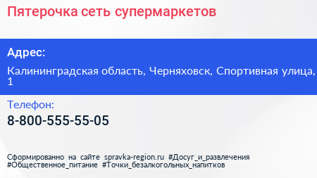 Пятерочка, сеть супермаркетов по адресу Калининградская область, Черняховск, Спортивная улица, 1 в дальнейшем Организация, размещена в следующих категориях: