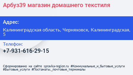 Арбуз39, магазин домашнего текстиля по адресу Калининградская область, Черняховск, Калининградская, 5 в дальнейшем Организация, размещена в следующих категориях: