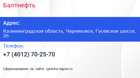 Балтнефть по адресу Калининградская область, Черняховск, Гусевское шоссе, 26 в дальнейшем Организация, размещена в следующих категориях: