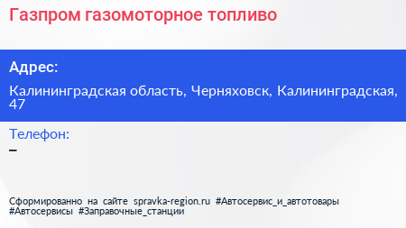 Газпром газомоторное топливо по адресу Калининградская область, Черняховск, Калининградская, 47 в дальнейшем Организация, размещена в следующих категориях: