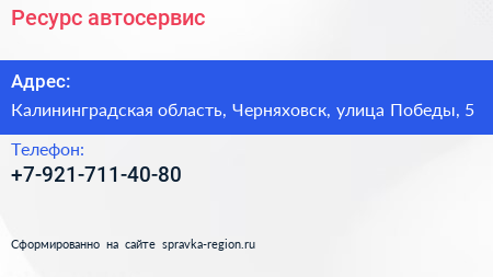 Ресурс, автосервис по адресу Калининградская область, Черняховск, улица Победы, 5 в дальнейшем Организация, размещена в следующих категориях: