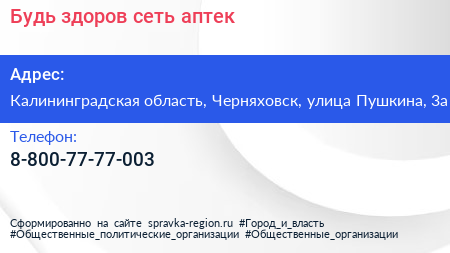Будь здоров!, сеть аптек по адресу Калининградская область, Черняховск, улица Пушкина, 3а в дальнейшем Организация, размещена в следующих категориях:
