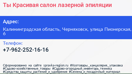 Ты Красивая, салон лазерной эпиляции по адресу Калининградская область, Черняховск, улица Пионерская, 6 в дальнейшем Организация, размещена в следующих категориях: