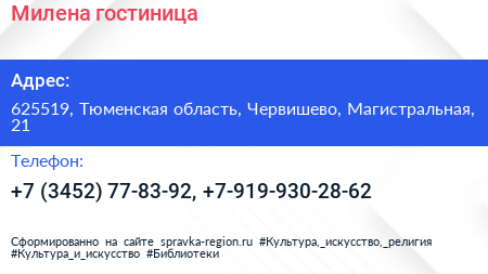 Милена, гостиница по адресу 625519, Тюменская область, Червишево, Магистральная, 21 в дальнейшем Организация, размещена в следующих категориях:
