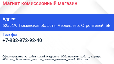 Магнат, комиссионный магазин по адресу 625519, Тюменская область, Червишево, Строителей, 6Б в дальнейшем Организация, размещена в следующих категориях: