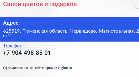 Салон цветов и подарков по адресу 625519, Тюменская область, Червишево, Магистральная, 2 ст2 в дальнейшем Организация, размещена в следующих категориях: