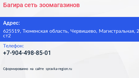 Багира, сеть зоомагазинов по адресу 625519, Тюменская область, Червишево, Магистральная, 2 ст2 в дальнейшем Организация, размещена в следующих категориях: