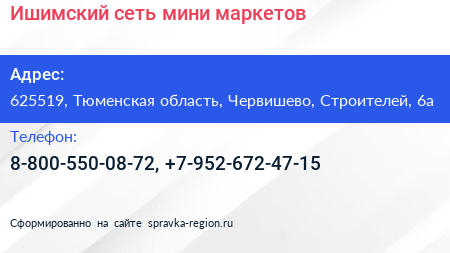 Ишимский, сеть мини-маркетов по адресу 625519, Тюменская область, Червишево, Строителей, 6а в дальнейшем Организация, размещена в следующих категориях: