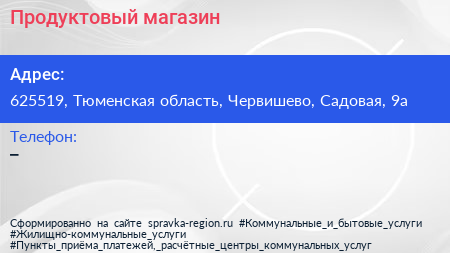 Продуктовый магазин по адресу 625519, Тюменская область, Червишево, Садовая, 9а в дальнейшем Организация, размещена в следующих категориях: