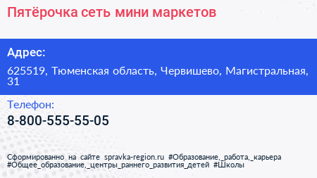 Пятёрочка, сеть мини-маркетов по адресу 625519, Тюменская область, Червишево, Магистральная, 31 в дальнейшем Организация, размещена в следующих категориях: